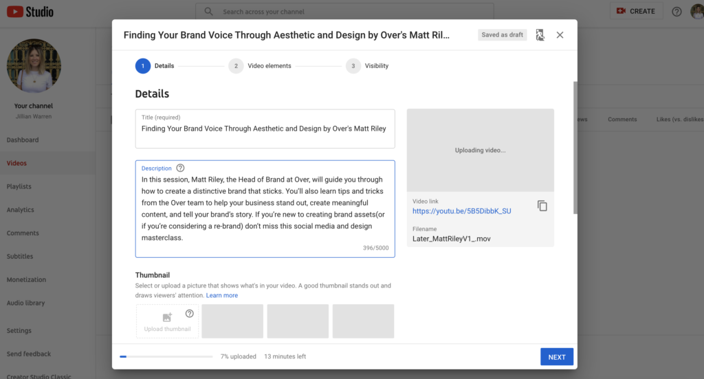 While your video uploads, you can start filling out your video title and description. These are two important fields for your SEO strategy, so it's worth spending a little time thinking about what people might search for if they want to discover your content.