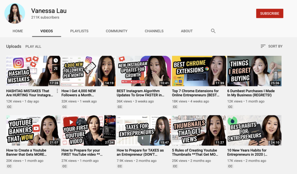 Take note of how social media coach and entrepreneur Vanessa Lau uses easy to read, attention-grabbing text overlays on all of her YouTube video thumbnails, often paired with an emotive reaction: