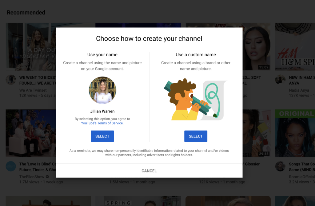 Next up, it's time to choose how to create your channel. You can either use the name and picture associated with your Google account, or create a channel using a brand or other name and picture.