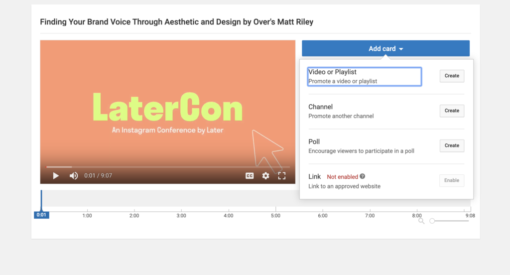 For pop-up cards, you can add prompts for a YouTube video or playlist, channel, poll, or a link to your website throughout your video — simply select a time point and add a card: