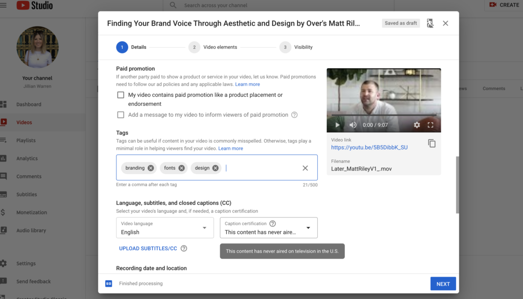 Open the advanced options to indicate if your video is part of a paid promotion, add search-assisting tags, select your video's language and, if needed, a caption certification.