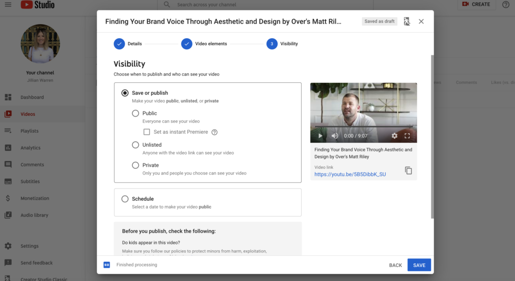 Finally, adjust the visibility of your video and hit save. You can select from Public, Unlisted, or Private, or schedule a date to make your new video public.