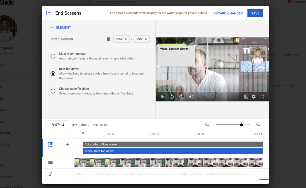 You can adjust the time period that your end screen is available, and also select which video is presented to the viewer. You can choose from your most recent upload, an auto-generated video based on the YouTube algorithm, or a specific video.