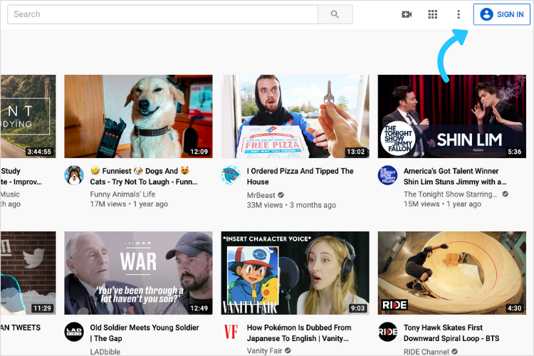 In order to create a YouTube channel, you'll need to sign into a Google account first. Tap the "Sign In" button at the top right of the screen to do this.